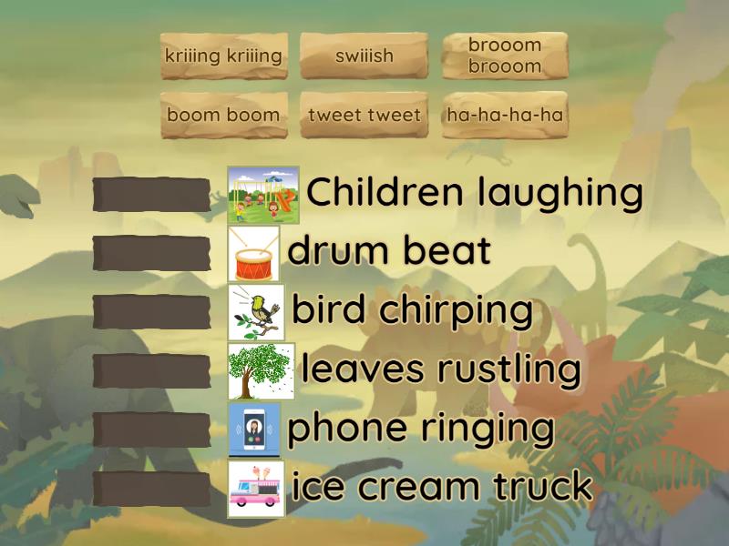 kriiing kriiing - phone ringing, swiiish - leaves rustling, boom boom - drum beat, ha-ha-ha-ha - Children laughing, brooom brooom - ice cream truck, tweet tweet - bird chirping,