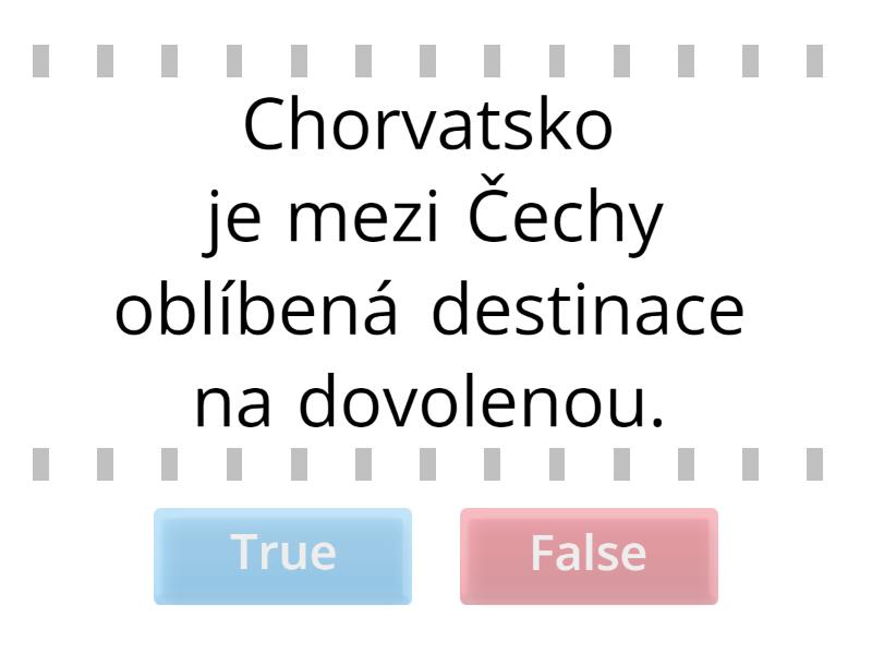 True: Chorvatsko je mezi Čechy oblíbená destinace na dovolenou. , Češi během covidu jezdili na dovolenou více do tuzemska., Očekává se, že ještě víc lidí z Česka letos dovolenou stráví v zahraničí. , False: Stále populárnější začíná být i dovolená ve Francii., Češi během covidu jezdili více do zahraničí. , Češi neradi jezdí na dovolenou do Rakouska. , Do Itálie na dovolenou Češi téměř nejezdí. ,