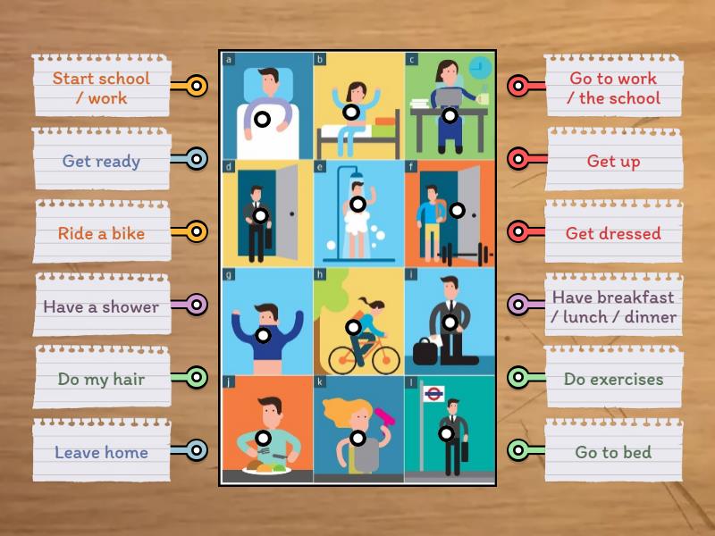 Go to bed, Get up , Start school / work, Leave home, Have a shower, Do exercises , Get dressed , Ride a bike, Get ready, Have breakfast / lunch / dinner, Do my hair, Go to work / the school.