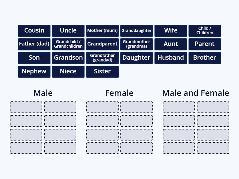 Male: Brother, Father (dad), Grandfather (grandad), Grandson, Husband, Nephew, Son, Uncle, Female: Aunt, Daughter, Granddaughter, Grandmother (grandma), Mother (mum), Niece, Sister, Wife, Male and Female: Child / Children, Cousin, Grandchild / Grandchildren, Grandparent, Parent,