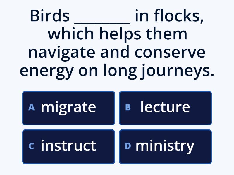 1) Birds ________ in flocks, which helps them navigate and conserve energy on long journeys. a) migrate b) lecture c) instruct d) ministry 2) Many people ______ to cities in search of better job opportunities. a) migrate b) lecture c) instruct d) ministry 3) She _________ her assistant to schedule meetings for the entire week. a) migrated b) lectured c) instructed d) ministry 4) He received a stern ________ from his parents about coming home late. a) migrate b) lecture c) instruct d) ministry 5) Can you ______ me on how to use this new tablet? a) migrate b) lecture c) instruct d) ministry 6) He has been selected to lead the ______ responsible for environmental protection. a) migrate b) lecture c) instruct d) ministry 7) The software company plans to ________ its data to a new cloud platform next month. a) migrate b) lecture c) instruct d) ministry 8) The manual __________ users to assemble the furniture in a specific order to ensure stability. a) migrates b) lectures c) instructs d) ministry 9) The ancient tribes used to _________ seasonally to find fertile land for farming. a) migrate b) lecture c) instruct d) ministry 10) The _________ of Education announced new reforms to improve the quality of schools. a) Migrate b) Lecture c) Instruct d) Ministry