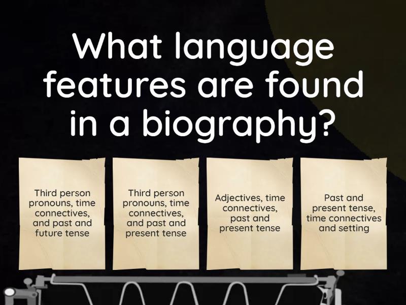 1) What language features are found in a biography? a) Third person pronouns, time connectives, and past and future tense b) Third person pronouns, time connectives, and past and present tense c) Adjectives, time connectives, past and present tense d) Past and present tense, time connectives and setting 2) What is a time connective? a) A word or phrase that tells us the time b) A time of day c) A word or phrase that tell us when something is happening d) The time the event occurred 3) Which word is the time connective: 'after school I play with my friends' a) after b) with 4) Which word is the time connective: 'I drink a glass of milk before going to bed' a) drink b) before 5) Which words are the time connectives: 'After her graduation she went to the party and then straight home to bed' a) 'after' and 'then' b) 'went' and 'then' 6) Which words are the time connectives: 'shortly after the museum opened there was a fire. Eventually the person was caught' a) 'shortly after' and 'was' b) 'shortly after' and 'eventually' 7) What are the 2 time connectives in this paragraph? a) 'began' and 'meanwhile' b) 'meanwhile' and 'hurried' c) 'thanked' and 'began' d) 'began' and 'away' 8) Which sounds better: 1 'it wasn't when he was 15 years old that he learnt how to ride a bike' or 2 'it wasn't until he was 15 years old that he learnt how to ride a bike' a) 1 b) 2 9) Which sounds better: 1 'whenever World War II started life became hard for Jewish people' or 2 'soon after World War II started life became hard for Jewish people' a) 2 b) 1