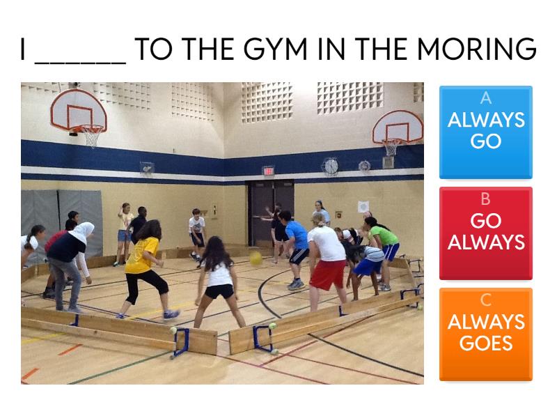 1) I ______ TO THE GYM IN THE MORING a) ALWAYS GO b) GO ALWAYS c) ALWAYS GOES  2) HE ______ DINNER AT 8 PM a) NEVER HAVES b) NEVER HAS c) HAS NEVER 3) MY GRANDSON _____ HIS HOMEWORK IN THE AFTERNOON.  a) USUALLY DO  b) USUALLY DOES c) DOES USUALLY 4) I ______ FOOTBALL ON SATURDAYS. a) DOESN´T PLAY b) DON´T PLAY c) PLAY DON'T 5) SHE __________ TV AT NIGHT a) SOMETIMES WATCHES b) SOMETIMES WATCH c) SOMETIMES WATCHS 6) ______ YOUR DAUGHTER _________ TO BED IN THE MORNING?  a) DOES / GO b) DO / GOES c) DO / GO 7) TOM AND KATE SOMETIMES ______ TO SCHOOL BY BUS. a) GOES b) GO  c) DO GO 8) DOES JEREMY FINISH WORK AT 6 PM?  a) YES, HE DOESN'T b) YES, HE DO c) YES, HE DOES 9) DO BOB AND SUSAN PLAY COMPUTER GAMES? a) NO, THEY DOESN'T  b) YES, THEY DO  c) YES, THEY DON'T  10) MY FRIENDS ________ TV AT NIGHT. a) DON'T WATCHES   b) DOESN'T WATCH  c) DON'T WATCH 11) ANNE _________ HOCKEY ON SATURDAYS a) PLAYS OFTEN b) OFTEN PLAYS c) OFTEN PLAY 12) HE ____________ TO SCHOOL ON SUNDAY. a) DOESN´T GO b) DON´T GO  c) DOESN´T GOES 13) I NEVER _____________ COFFEE AT NIGHT. a) DRINK b) DRINKS c) DON´T DRINK 14) SHE_________________________ BREAKFAST AT 8AM. a) HAS ALWAYS b) HAVE ALWAYS c) ALWAYS HAS