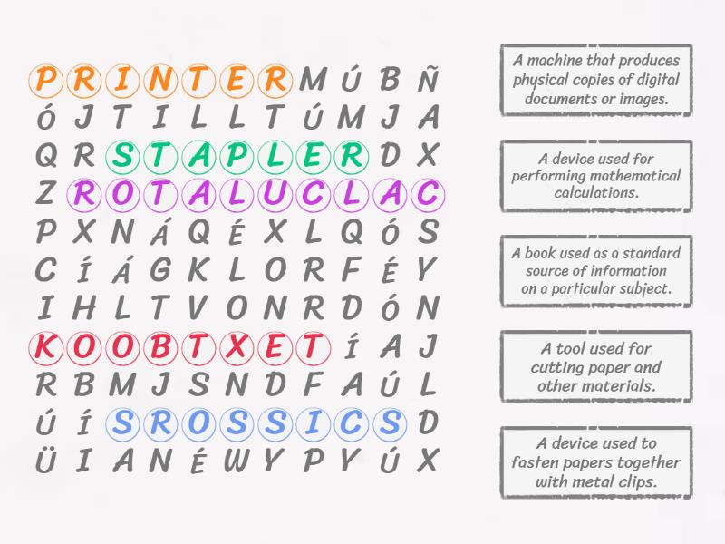 Textbook - A book used as a standard source of information on a particular subject., Stapler - A device used to fasten papers together with metal clips., Printer - A machine that produces physical copies of digital documents or images., Calculator - A device used for performing mathematical calculations., Scissors - A tool used for cutting paper and other materials.,