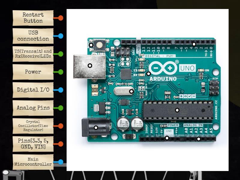USB connection, Power, Restart Button, Main Microcontroller, Analog Pins, Pins[3.3, 5, GND, VIN], Digital I/O, TS[Transmit] and Rx[Receive]LEDs, Crystal Oscillator[Time Regulator].