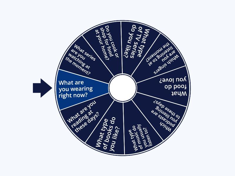 1) What type of TV series do you like? 2) What type of books do you like? 3) What type of music do you usually listen to? 4) What are you reading at these days? 5) What series are you watching at the moment? 6) What are you wearing right now? 7) Which singers are you listening to at the moment? 8) Which podcasts are you litening to these days? 9) What food do you love? 10) Do you cook or shop for food at your home?