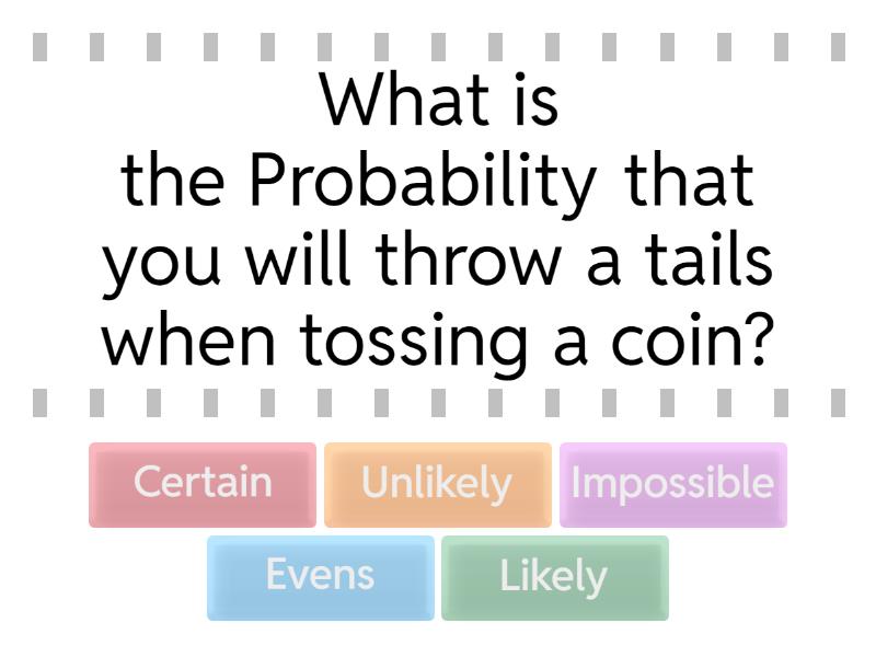 Evens - What is the Probability that you will throw a tails when tossing a coin?, Certain - What is the probability that Monday comes after Sunday?, Unlikely - What is the probability of throwing a 1 on a dice ?, Likely - What is the probability of sunshine in Spain in July?, Impossible - What is the probability of living to 200 years old?,