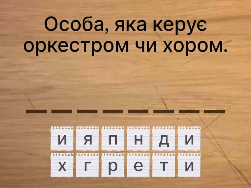 велосипед - Машина для їзди, яку рухають ногами за допомогою педалей., фортепіано - Струнний ударно-клавішний інструмент, сучасними різновидами якого є рояль і піаніно., диригент - Особа, яка керує оркестром чи хором., жестикуляція - Застосування рухів тіла (головним чином рук) під час розмови з метою посилення її виразності., екстремальний - Дуже значний, надзвичайний своїм виявом, силою, величиною тощо., ожеледиця - Шар льоду на земній поверхні, що утворюється після дощу або відлиги в разі зниження температури., левада - Присадибна ділянка землі із сінокосом, горо́дом, садом або іншими деревами., експедиція - Подорож, поїздка, відрядження групи людей зі спеціальною метою, спеціальним завданням., речитатив - Промовляння співучим голосом, наспівним декламуванням., вінегрет - Холодна страва з дрібно нарізаних овочів., абонемент - Реєстрова бібліотечна картка читача-абонента.,