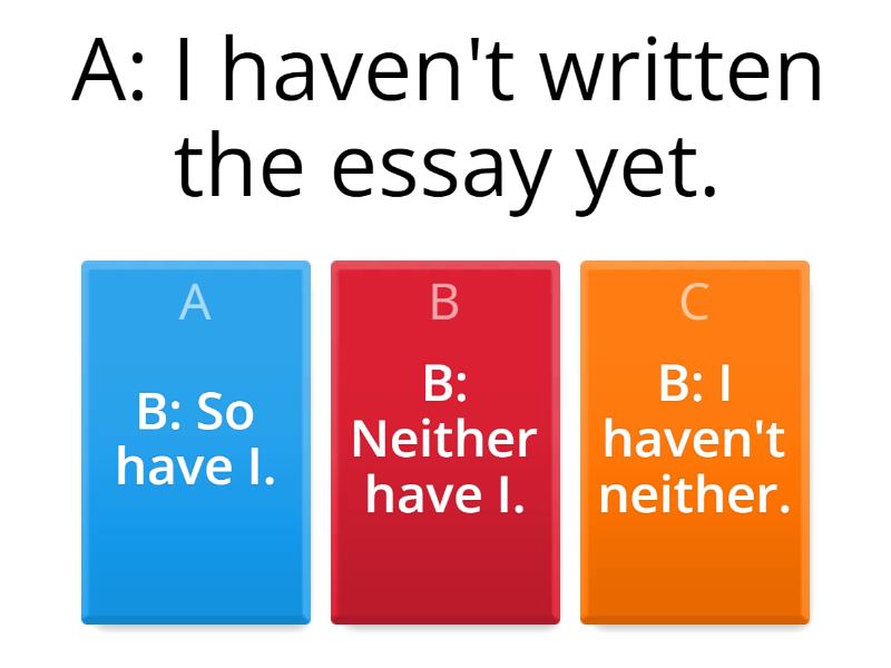 1) A: I haven't written the essay yet. a) B: So have I. b) B: Neither have I. c) B: I haven't neither. 2) A: I'm very thirsty. a) B: So am I. b) B: Neither am I. c) B: Nor am I. 3) A: Sam won't help us. a) B: So will Mary. b) B: Neither will Mary. c) B: Mary won't neither 4) A: I can't forgive them for what happened. a) B: So can I. b) B: Neither can I. c) B: I can't neither. 5) A: I drink too much coffee. a) B: So do I. b) B: Neither do I. c) B: Nor do I. 6) A: Mum was very proud of us. a) B: So was dad. b) B: Neither was dad. c) B: Nor was dad. 7) A: Ann will be there. a) B: So will her sister. b) B: Her sister will so. c) B: Her sister so will. 8) A: You didn't tell the truth. a) B: So did you. b) B: Neither didn't you. c) B: Nor did you. 9) A: I watched the match in a pub. a) B: So did I. b) B: I did so. c) B: I so did. 10) A: I would really like to go. a) B: So would I. b) B: Nor would I. c) B: I would so.