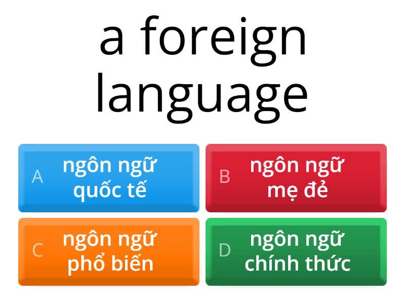 1) a foreign language a) ngôn ngữ quốc tế b) ngôn ngữ mẹ đẻ c) ngôn ngữ phổ biến d) ngôn ngữ chính thức 2) strengthen a) củng cố b) đẩy mạnh c) cài đặt d) yêu cầu 3) opens up job opportunities a) mở cơ hội b) mở ra cơ hội việc làm c) cơ hội việc làm d) tìm kiếm cơ hội việc làm 4) benefits a) điểm bất lợi b) lợi ích c) yêu cầu d) tình huống 5) experience a) trải nghiệm b) ví dụ c) đặc biệt d) cơ hội 6) look for a) tìm kiếm b) đặt hàng c) tìm ra d) yêu cầu 7) offer a special experience a) đưa ra trải nghiệm đặc biệt b) tìm kiếm trải nghiệm c) tìm kiếm trải nghiệm đặc biệt d) tìm kiếm 8) ask for directions a) chỉ đường b) tìm đường c) hỏi đường d) lạc đường 9) culture a) văn hoá b) phong tục c) thủ tục d) truyền thống 10) better a) tốt hơn b) tốt c) tồi tệ hơn d) tồi tệ 11) ability a) khả năng b) cơ hội c) công việc d) lý do 12) communication with a) giao tiếp với b) đối xử với c) nói chuyện với d) nghe 13) a better understanding a) sự hiểu biết tốt hơn b) cơ hội tốt hơn c) cơ hội việc làm tốt hơn d) tốt hơn 14) necessary a) không cần thiết b) khó c) cần thiết d) quan trọng 15) boring a) thú vị b) dễ c) khó d) buồn chán