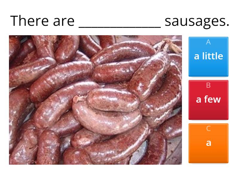 1) There are _____________ sausages. a) a little b) a few c) a 2) There isn't ____________ cheese. a) some b) a little c) any 3) ______________ lot of salad in the fridge. a) There are b) There is a c) There is 4) There's _____________ bread. a) any b) a few c) a little 5) There's ________________ olive oil. a) a few b) many c) a lot of 6) _________ there ___________ eggs? a) Is _________ any b) Are ___________ any 7) _________ there __________ sugar? a) Is_________any b) Are___________any 8) There isn't ____________ butter. a) many b) any c) a few 9) ________________ bread is there? a) How much b) How many 10) _______________ biscuits are there? a) How much b) How many 11) How much ____________ is there?  a) burgers b) milk c) potatoes 12) How many ________________ are there? a) eggs b) water c) salad 13) I need _______________ tomatoes. a) a little b) a few c) a lot 14) There isn't ____________ flour. a) any b) many c) some