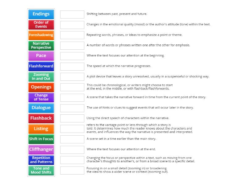 Order of Events - This could be chronological, or writers might choose to start at the end, in the middle, or with flashback/flashforwards., Flashback - A scene set in a time earlier than the main story., Flashforward - A scene that takes the narrative forward in time from the current point of the story., Shift in Focus - Changing the focus or perspective within a text, such as moving from one character’s thoughts to another’s, or from a broad scene to a specific detail., Repetition and Patterns - Repeating words, phrases, or ideas to emphasize a point or theme., Zooming In and Out - Focusing in on a small detail (zooming in) or broadening the view to show a wider scene or context (zooming out)., Dialogue - Using the direct speech of characters within the narrative., Tone and Mood Shifts - Changes in the emotional quality (mood) or the author’s attitude (tone) within the text., Openings - Where the text focuses our attention at the beginning., Endings - Where the text focuses our attention at the end., Narrative Perspective - refers to the vantage point or lens through which a story is told. It determines how much the reader knows about the characters and events, and influences the way the narrative is presented and interpreted., Listing - A number of words or phrases written one after the other for emphasis., Pace - The speed at which the narrative progresses., Cliffhanger - A plot device that leaves a story unresolved, usually in a suspenseful or shocking way., Change of Tense - Shifting between past, present and future., Foreshadowing - The use of hints or clues to suggest events that will occur later in the story.,