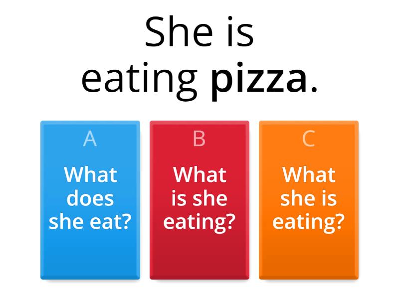 1) She is eating pizza. a) What does she eat? b) What is she eating? c) What she is eating? 2) They are watching TV. a) What are they doing? b) What are they watching? c) Who are watching TV? 3) She is studying because she has a test.  a) Who is studying? b) How is she studying? c) Why is she studying? 4) We are travelling to Spain next week. a) Where are we travelling to next week? b) When we are travelling to Spain? c) Who are travel to Spain next week? 5) Lisa and Tom are writing a story. a) Who writes a story? b) Who are writing a story? c) Who is writing a story? 6) Today, I am wearing a sweater. a) When is he wearing a sweater? b) Why am I wearing a sweater? c) When are you wearing a sweater? 7) I am feeling very excited now. a) How are you feeling now? b) How you are feel today? c) How is he feeling now? 8) He is reading Tom's poem. a) What poem he is reading? b) Whose poem is he reading? c) Whose poem are you reading?