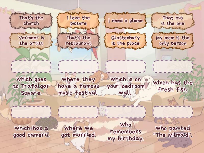 That's the church - where we got married. , I need a phone - which has a good camera. , My mom is the only person - who remembers my birthday. , I love the picture - which is on your bedroom wall. , That bus is the one - which goes to Trafalgar Square. , Glastonbury is the place - where they have a famous music festival. , Vermeer is the artist - who painted "The Milmaid". , That's the restaurant - which has the fresh fish. ,