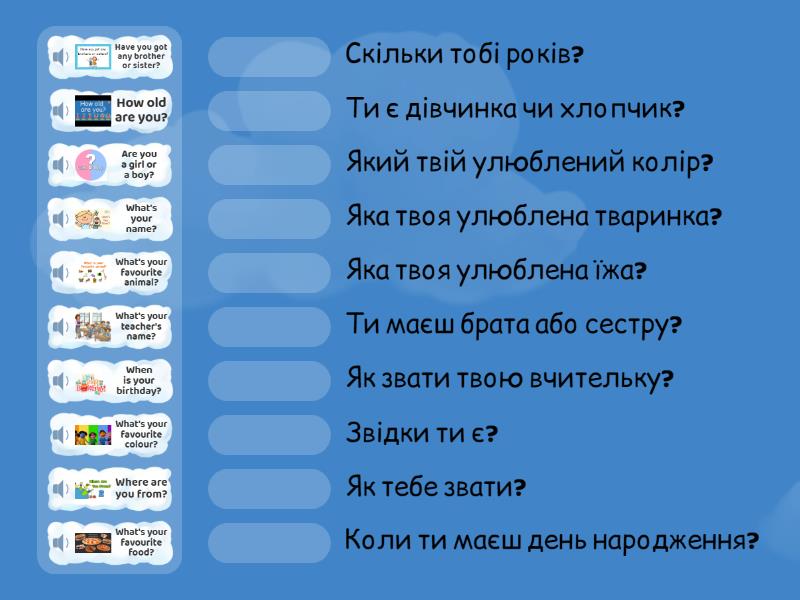 What's your name? - Як тебе звати?, What's your favourite animal? - Яка твоя улюблена тваринка?, Where are you from? - Звідки ти є?, How old are you? - Скільки тобі років?, Have you got any brother or sister? - Ти маєш брата або сестру?, When is your birthday? - Коли ти маєш день народження?, Are you a girl or a boy? - Ти є дівчинка чи хлопчик?, What's your favourite colour? - Який твій улюблений колір?, What's your favourite food? - Яка твоя улюблена їжа?, What's your teacher's name? - Як звати твою вчительку?,