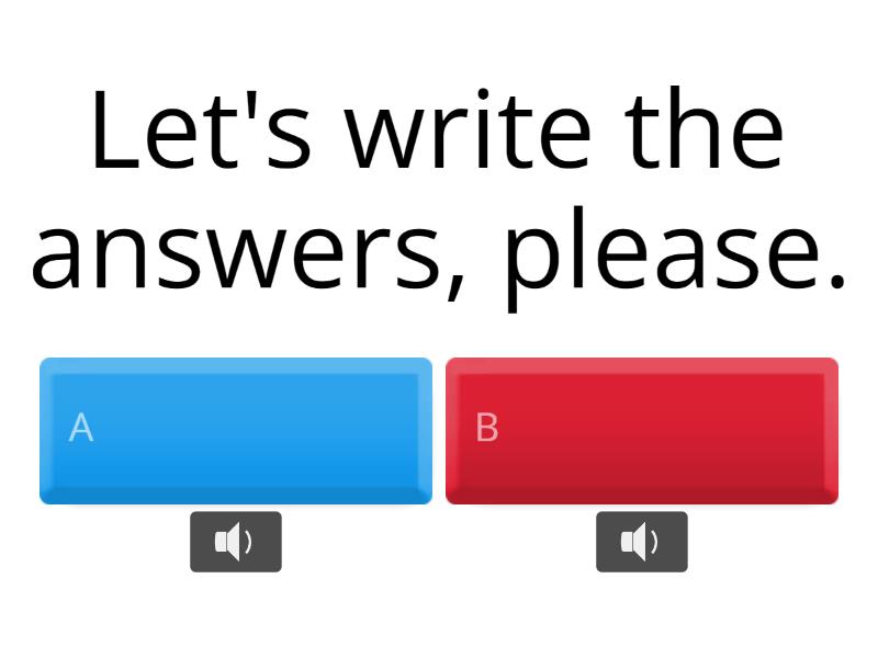 1) Let's write the answers, please. a) b) 2) Repeat. a) b) 3) Hand in the homework, please. a) b) 4) Let's read pages 1- 10, please. a) b) 5) You don't understand? a) b) 6) Pay attention, please. a) b) 7) Take out your things, please.  a) b) 8) Let's watch the video, please. a) b) 9) Let's do problems 15 and 17.  a) b) 10) See you tomorrow. a) b)