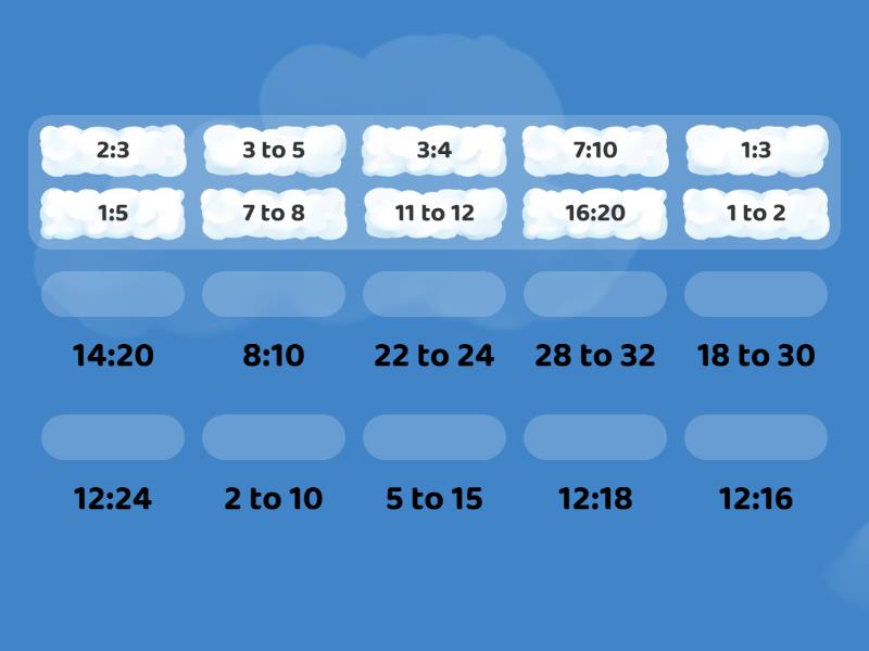 3:4 - 12:16, 1 to 2 - 12:24, 1:5 - 2 to 10, 3 to 5 - 18 to 30, 7:10 - 14:20, 11 to 12 - 22 to 24, 16:20 - 8:10, 2:3 - 12:18, 1:3 - 5 to 15, 7 to 8 - 28 to 32,
