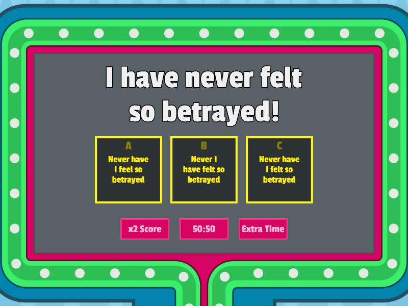 1) I have never felt so betrayed! a) Never have I feel so betrayed b) Never I have felt so betrayed c) Never have I felt so betrayed 2) You shouldn't talk badly about your boss under any circumstances a) Under any circumstances should you talk... b) Under no circumstances should you talk... c) Under no circumstances you should talk... 3) I seldom talk to her a) Seldom do I talk to her b) Seldom I talk to her c) Seldom I do talk to her 4) He talks to me only when he wants something a) Only he talks to me when he wants something b) Only when does he want something he talks to me c) Only when he wants something does he talk to me 5) She was not only smart, she was kind too a) Not only she was smart, was she kind too b) Not only was she smart, she was kind too c) Not only she was smart, she was kind too 6) He didn't tell me about it until I confronted him a) Not until I confronted him, did he tell me about it b) Until I did confront him, he told me about it c) Not until I did confront him, he told me about it 7) I'll listen to you only if you listen to me a) Only if you listen to me, I will listen to you b) Only if will listen to me, will I listen to you c) Only if you listen to me, will I listen to you 8) I had no sooner finished the project than he asked me for it a) No sooner I finished than he asked me for it b) No sooner had I asked for the project than he asked for it c) No sooner I had finished the projected than he asked me for it