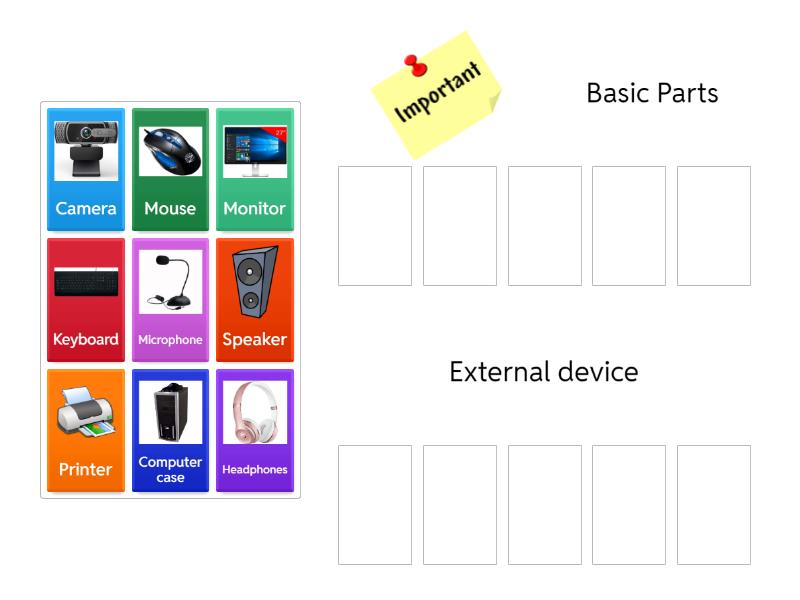 Basic Parts: Monitor, Mouse, Keyboard, Computer case, External device: Camera, Speaker, Printer, Headphones, Microphone,