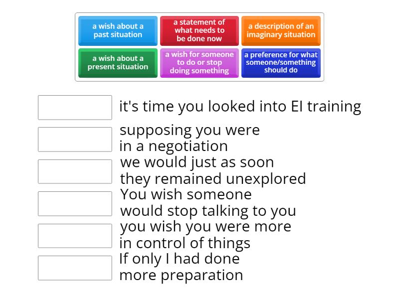 a wish about a past situation - If only I had done more preparation, a wish for someone to do or stop doing something - You wish someone would stop talking to you, a wish about a present situation - you wish you were more in control of things , a description of an imaginary situation - supposing you were in a negotiation, a statement of what needs to be done now - it's time you looked into EI training , a preference for what someone/something should do - we would just as soon they remained unexplored,