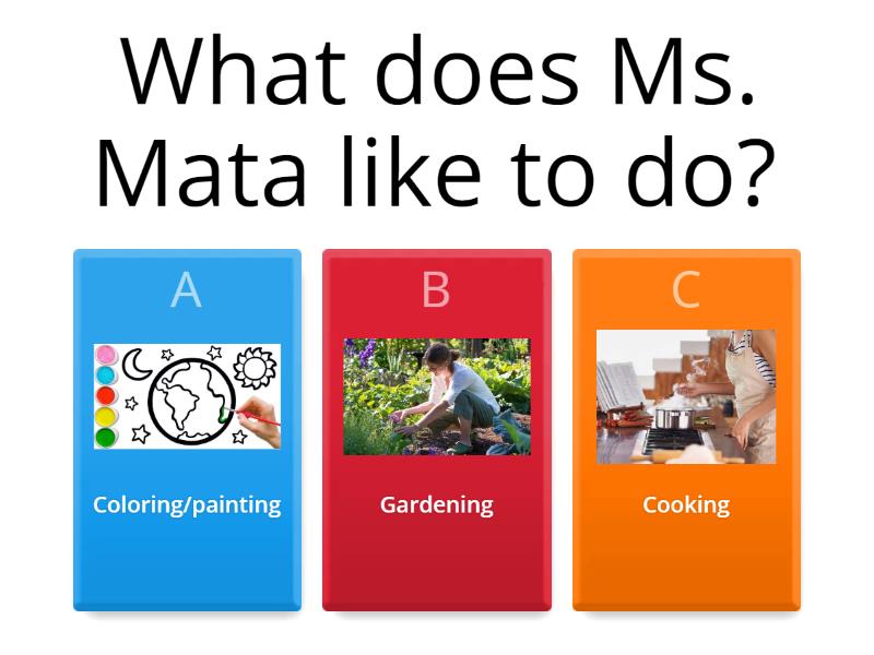 1) What does Ms. Mata like to do? a) Coloring/painting b) Gardening c) Cooking 2) What is something that Ms. Mata is proud of? a) Raised a Horse b) Bought a boat c) Ran a Half a Marathon 3) What did Ms. Mata want to be before becoming a School Counselor? a) Astronaut b) Nurse c) Lawyer 4) What is Ms. Mata's favorite color? a) Green b) Pink c) Purple 5) What is Ms. Mata's favorite Snack? a) Cucumbers with lemon b) yogurt c) Hot Cheetos 6) What is Ms. Mata's favorite restaurant? a) Red Lobster b) Chilis c) Olive Garden 7) What animals does Ms. Mata have? a) Dog/tortoise b) Cat/fish c) Bird/chickens 8) Who is Ms. Mata's favorite team? a) Astros/Texans b) Chicago Cubs/Cowboys 9) Who is Ms. Mata's favorite NBA team? a) Spurs b) Lakers c) Celtics 10) Ms. Mata is so grateful for ? a) YOU!! b) Y 11) Ms. Mata is a proud mom of a Baby Boy named? a) Rene b) R