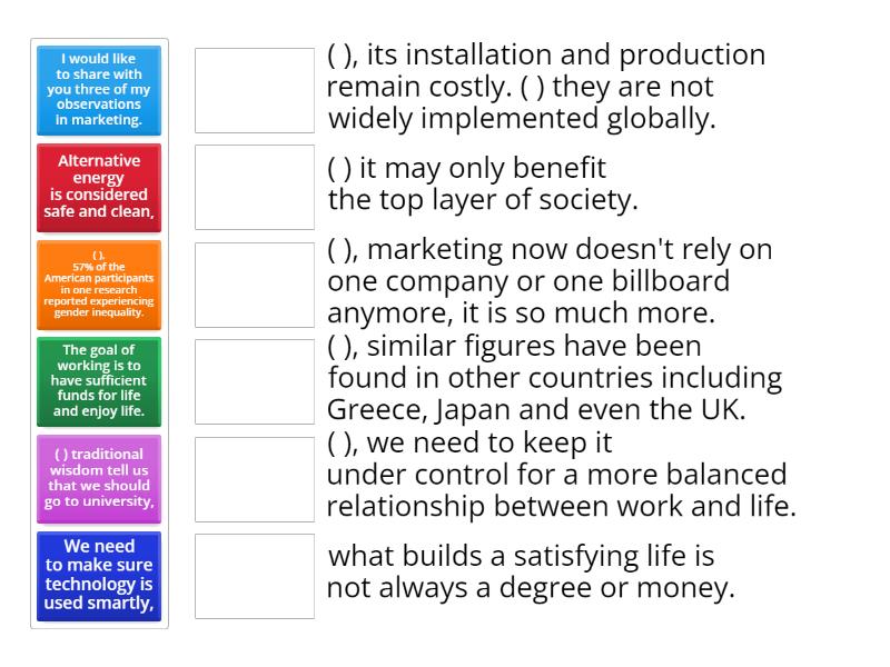 We need to make sure technology is used smartly,  - ( ) it may only benefit the top layer of society. , The goal of working is to have sufficient funds for life and enjoy life.  - ( ), we need to keep it under control for a more balanced relationship between work and life.  , ( ) traditional wisdom tell us that we should go to university, - what builds a satisfying life is not always a degree or money. , I would like to share with you three of my observations in marketing. - ( ), marketing now doesn't rely on one company or one billboard anymore, it is so much more. , ( ), 57% of the American participants in one research reported experiencing gender inequality. - ( ), similar figures have been found in other countries including Greece, Japan and even the UK.  , Alternative energy is considered safe and clean, - ( ), its installation and production remain costly. ( ) they are not widely implemented globally.,