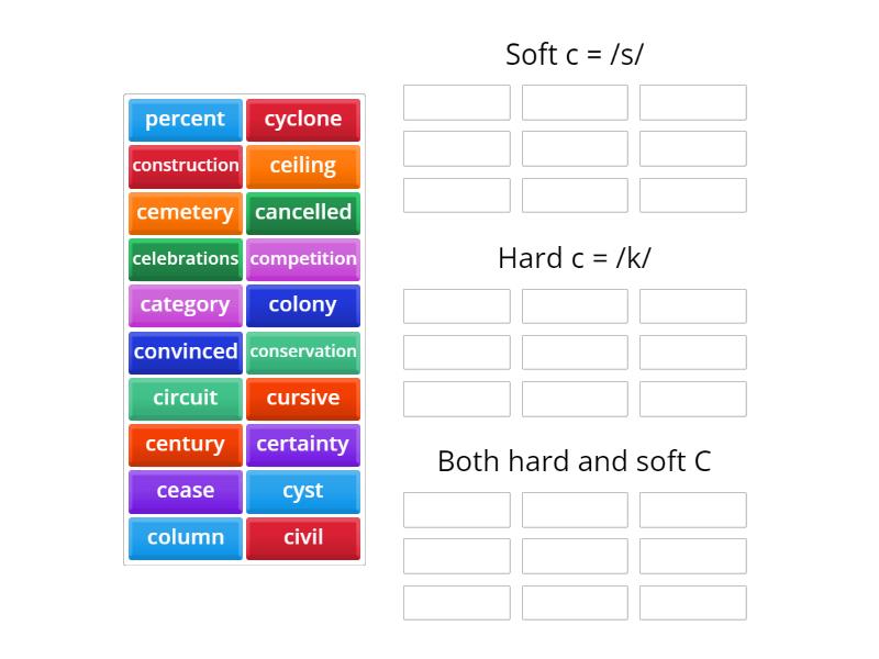 Soft c = /s/: civil, century, celebrations, cemetery, cease, cyst, ceiling, percent, certainty, Hard c = /k/: competition, category, colony, column, conservation, cursive, construction, Both hard and soft C: cancelled, circuit, cyclone, convinced,