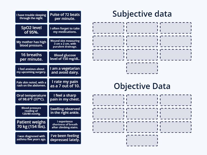 Subjective data: I feel a sharp pain in my chest., I was diagnosed with asthma five years ago., I feel anxious about my upcoming surgery., I rate my pain as a 7 out of 10., I have trouble sleeping through the night., I’ve been feeling depressed lately., I am a vegetarian and avoid dairy., I experience shortness of breath after climbing stairs., I often forget to take my medications., My mother has high blood pressure., Objective Data: Blood pressure reading of 120/80 mmHg., Oral temperature of 98.6°F (37°C)., Pulse of 72 beats per minute., 16 breaths per minute., SpO2 level of 95%., Swelling observed in the right ankle., Pale skin noted, with a rash on the abdomen., Patient weighs 70 kg (154 lbs)., Blood glucose level of 150 mg/dL., Wound size measuring 3 cm x 2 cm, with purulent drainage.,