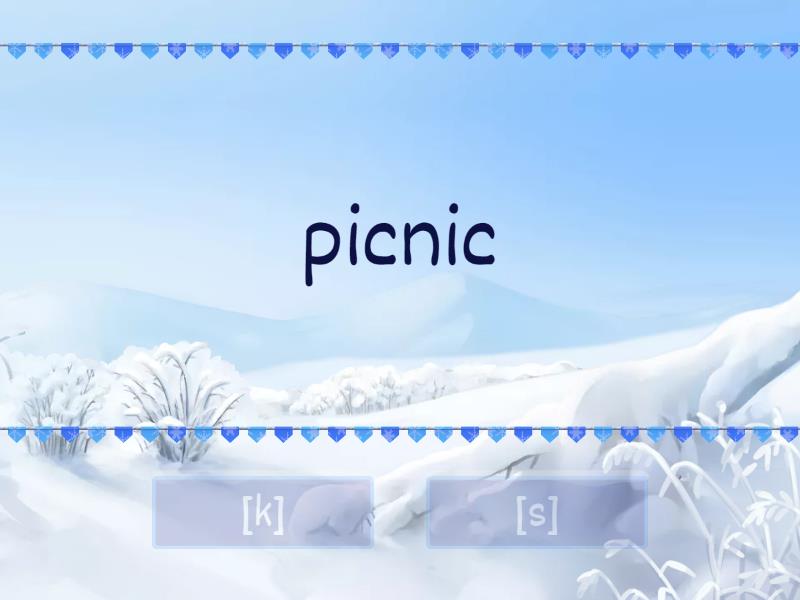 [k]: picnic, control, cut, carry, apricot, came, cry, correct, cookies, cook, cock, cold, crime, come, close, class, camp, clock, fact, crate, carrot, car, card, clear, crane, crab, cave, camera, clean, coffee, [s]: space , ice, nice, voice, slice, mice, cereal, rice, cent, trace, price, spice, peace, fancy, officer, pencil, race, dance, twice, face, fence, city, cell, cinema, process, icy, once, place, police, office,