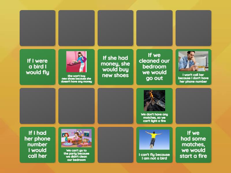 She won't buy new shoes because she doesn't have any money - If she had money, she would buy new shoes, We can't go to the party because we didn't clean our bedroom - If we cleaned our bedroom we would go out, I won't call her because I don't have her phone number - If I had her phone number I would call her, We don't have any matches, so we can't light a fire - If we had some matches, we would start a fire, I can't fly because I am not a bird - If I were a bird I would fly, They can't travel because they have 3 children - If they didn't have children, they would travel, I can't ride a horse because I don't have one - If I had a horse, I would ride it, I can't have a driving license because I'm 16 years old - If I were older, I would have my driving license, Shakira didn't win an Oscar because she isn't an actress - If Shakira were an actress, she would win an Oscar, Messi can't visit Argentina without a bodyguard because he is too famous - If Messi weren't too famous, he would visit Argentina without a bodyguard,