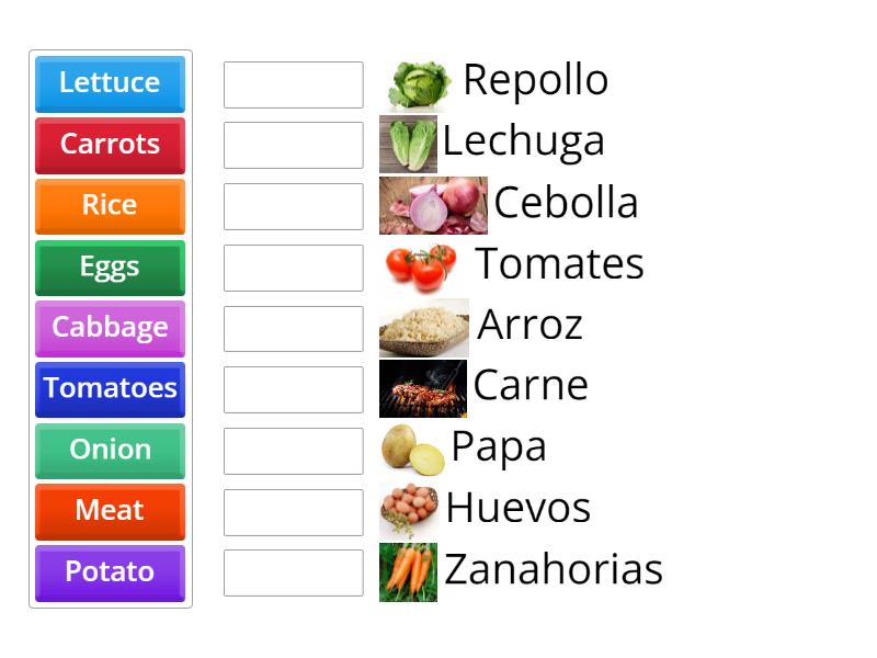 Carrots - Zanahorias, Tomatoes - Tomates, Lettuce - Lechuga, Cabbage - Repollo, Onion - Cebolla, Corn - Maíz/choclo, Celery - Apio, Potato - Papa, Banana - Platano, Apple - Manzana, Strawberry - Frutilla, Cherry - Cereza, Grapes - Uvas, Pear - Pera, Pineapple - Piña, Watermelon - Sandía, Fish - Pescado, Meat - Carne, Juice - Jugo, Milk - Leche, Eggs - Huevos, Pasta - Pasta, Rice - Arroz, Bread - Pan, Sandwiches - Sandwiches, Cheese - Queso,