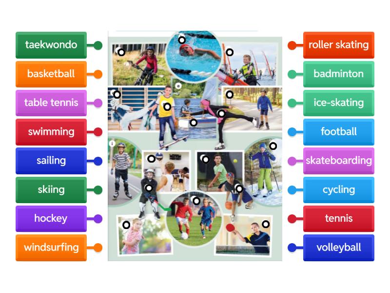 cycling, swimming, windsurfing, taekwondo, skateboarding, sailing, ice-skating, roller skating, hockey, football, tennis, basketball , skiing, table tennis, volleyball , badminton.