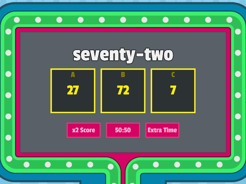 1) seventy-two a) 27 b) 72 c) 7 2) fifty-six a) 56 b) 65 c) 6 3) 10 and 3 more a) 3 b) 10 c) 13 4) 7 and 4 more a) 11 b) 10 c) 4 5) 50 and 20 a) 50 b) 70 c) 100 6) 10 and 40 a) 5 b) 40 c) 50