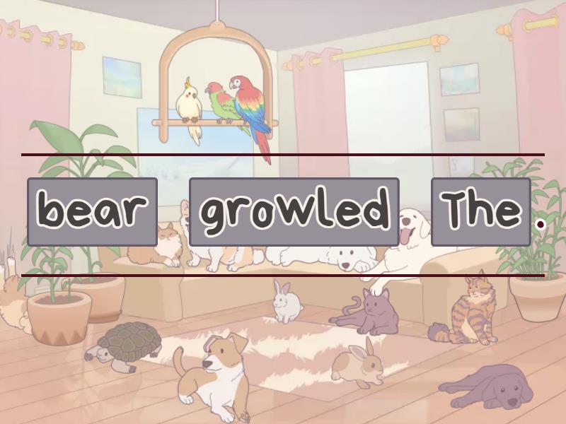 The bear growled., She plays jump rope., The boy ate an apple., My mom made dinner., The children looked for the book. , Fish swim back and forth., The cat licks its paws., Pam walks her dog., Jose kicks the ball., The dog walked down the street. ,