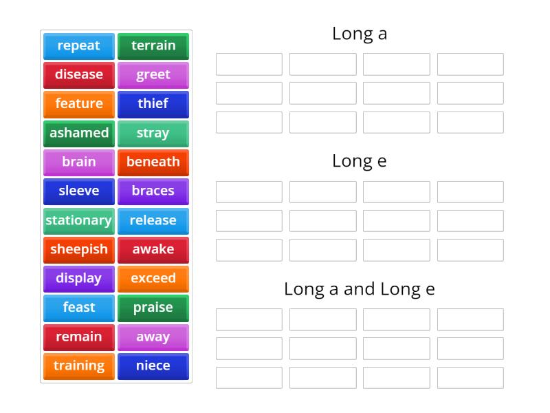 Long a: awake, stray, praise, display, braces, ashamed, brain, away, training, stationary, terrain, Long e: feast, greet, disease, repeat, thief, sleeve, beneath, sheepish, release, niece, feature, exceed, Long a and Long e: remain,