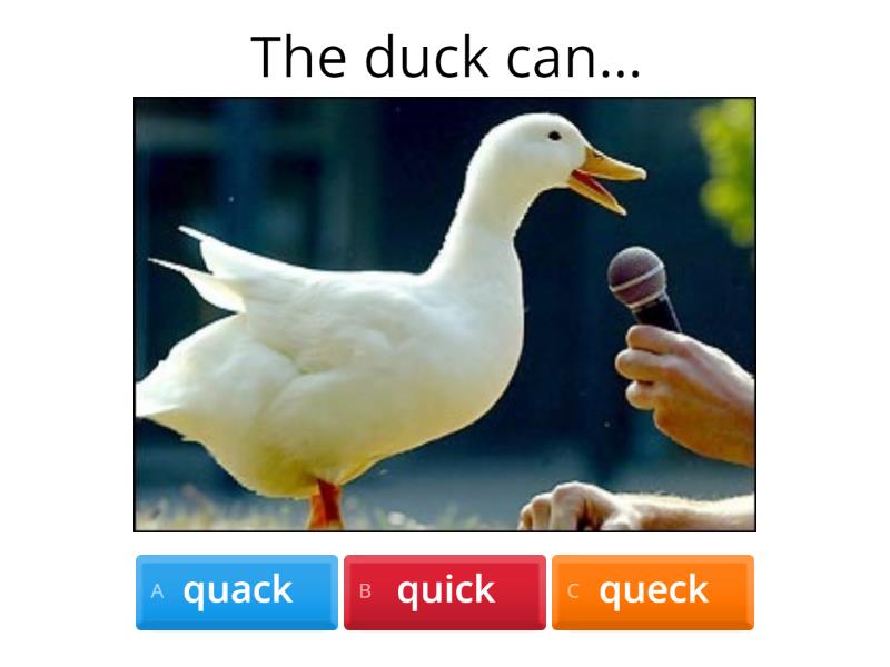 1) The duck can... a) quack b) quick c) queck 2) The red man can run... a) quog b) quick c) quack 3) We can all win this big... a) quiz b) quex c) quix 4) We will not... a) quid b) quit c) quip