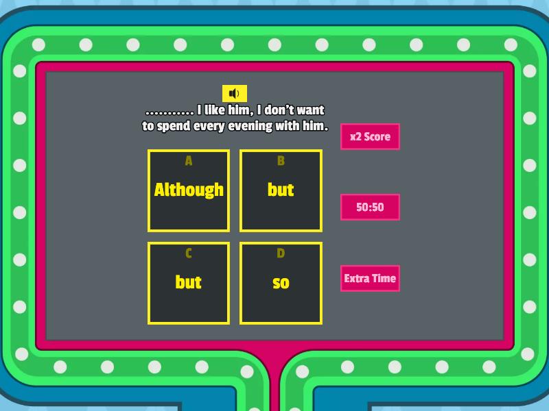 1) ........... I like him, I don't want to spend every evening with him. a) Although b) but c) but d) so 2) She liked him .................. she did not want to marry him a) Although b) Although c) so d) but 3) .............. John had more years of experience than Peter, he did not get the promotion. a) Although b) so c) but d) but 4) She wanted to go on holiday .................... she was short of money. a) because b) Although c) but d) Although 5) I bought a car ................ I need it for my job a) Although b) but c) because d) so 6) .................... few people participated in the program, it was a commercial success. a) Although b) but c) but d) because 7) The last bus had gone ............................. we had to walk home. a) Although b) so c) because d) Although