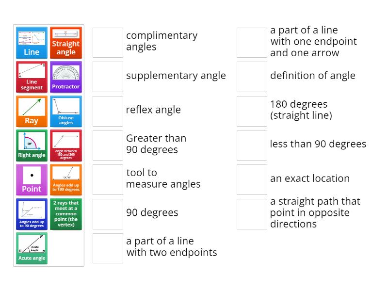 Point - an exact location, Line - a straight path that point in opposite directions, Line segment - a part of a line with two endpoints, Ray - a part of a line with one endpoint and one arrow, Right angle - 90 degrees, Acute angle - less than 90 degrees, Obtuse angles - Greater than 90 degrees, Straight angle - 180 degrees (straight line), Protractor - tool to measure angles, Angles add up to 90 degrees - complimentary angles, Angles add up to 180 degrees - supplementary angle, Angle between 180 and 360 degrees - reflex angle, 2 rays that meet at a common point (the vertex) - definition of angle,