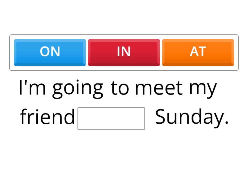 I'm going to meet my friend____ Sunday. We have a lot of parties ____ Christmas. We met ____ 1992. I was born ____ 29th March. The supermarket closes ____ 9 pm. Her birthday is ____ July. I lived ____ London for ten years. I have an English class____ Wednesday and Friday. She likes playing computer games ____ the evenings. You can see stars in the sky ____ night. My brother works in a restaurant ____ the afternoon. We usually go to the cinema ____ Fridays. It is usually snowy ____ winter. Are you free ____ the weekend? The school year ends ____ 25th June. He lives ____ 21 Cambridge Gardens. We celebrate Christmas ____ December. The shops are closed ____ Easter day. Petra usually takes a nap ____ the afternoon. Sam has breakfast ____ 8.30 in the morning. I go to the beach ____ summer. My best friend lives ____ Hong Kong. I always go to Marks and Spencers____ Oxford Street.