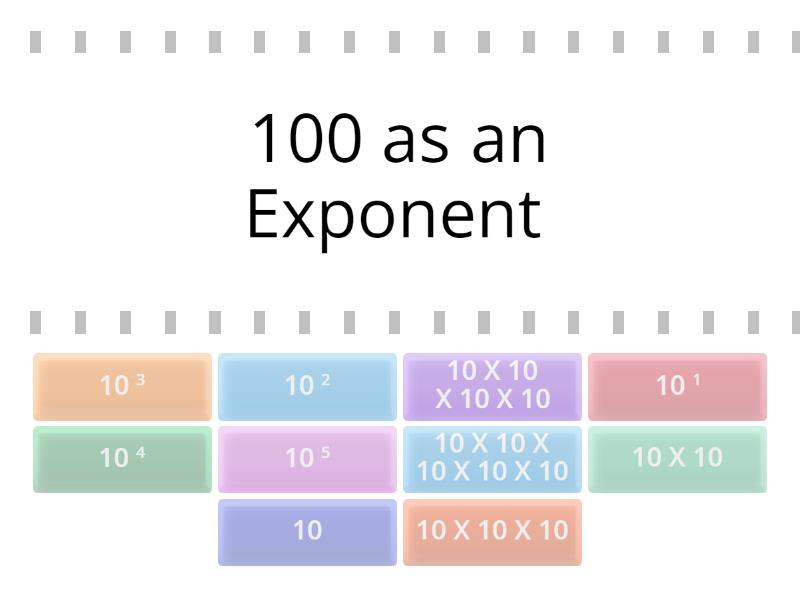 10 2 - 100 as an Exponent , 10 1 - 10 as an Exponent, 10 3 - 1,000 as an Exponent , 10 4 - 10,000 as an Exponent , 10 5 - 100,000 as an Exponent, 10 - 10 as a Power of 10, 10 X 10 - 100 as a Power of 10, 10 X 10 X 10 - 1,000 as a Power of 10, 10 X 10 X 10 X 10 - 10,000 as a Power of 10, 10 X 10 X 10 X 10 X 10 - 100,000 as a Power of 10,