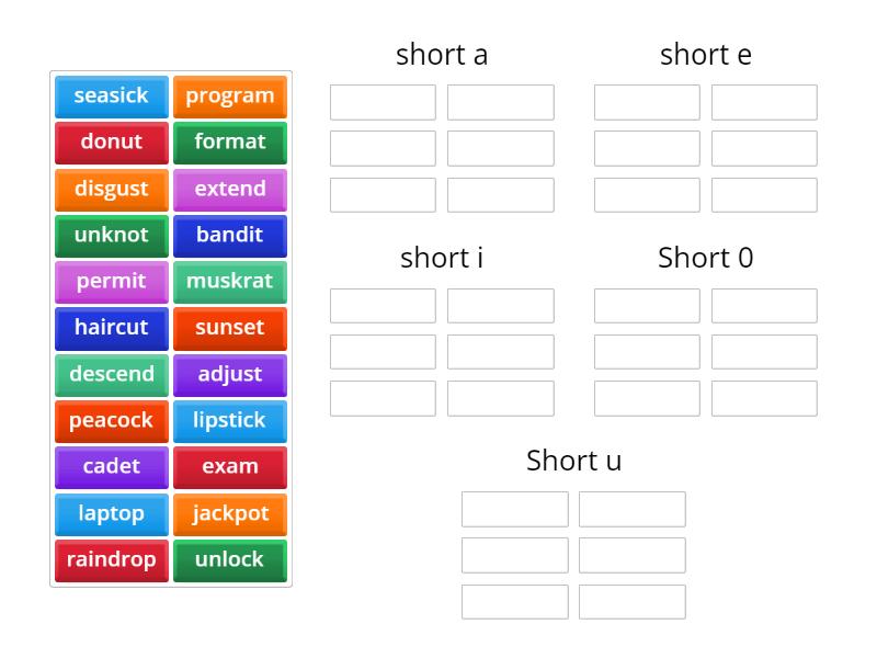 short a: exam, program, format, muskrat, short e: descend, extend, cadet, sunset, short i: lipstick, seasick, bandit, permit, Short 0: peacock, unlock, laptop, raindrop, jackpot, unknot, Short u: adjust, disgust, donut, haircut,