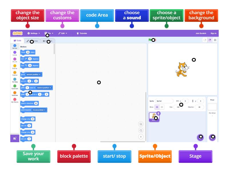 start/ stop , block palette , Sprite/Object , choose a sprite/object , change the customs, choose a sound , Save your work, change the background , Stage, code Area, change the object size.
