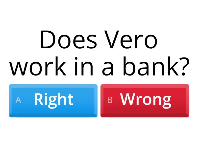 1) Does Vero work in a bank? a) Right b) Wrong 2) Is you study a Civil Engineering student? a) Right  b) Wrong 3) Does you like this shirt? a) Right b) Wrong 4) Does Angel play the piano? a) Right b) Wrong 5) Are they always eat here? a) Right b) Wrong 6) Does Sarah know your email address? a) Right b) Wrong 7) Are Vero and Angel go on vacation? a) Right b) Wrong 8) Is she at home? a) Right b) Wrong 9) Am I too short? a) Right b) Wrong 10) Is Alex and his wife in Acapulco? a) Right b) Wrong