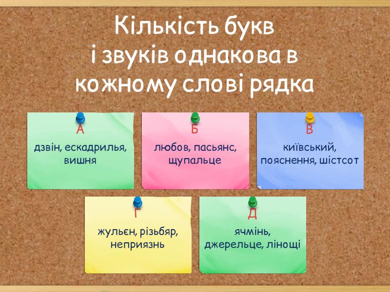 1) Кількість букв і звуків однакова в кожному слові рядка a) дзвін, ескадрилья, вишня b) любов, пасьянс, щупальце c) київський, пояснення, шістсот d) жульєн, різьбяр, неприязнь e) ячмінь, джерельце, лінощі 2) Однакова кількість звуків і букв у всіх словах рядка a) надзьобувати, юшечка, щасливець b) бджолосім’я, розмаїтість, обличчя c) єднання, сором’язливість, щирість d) джерельце, льодовий, щільний e) зшивати, рум’янець, дзеркальце 3) Однакова кількість звуків і букв у кожному слові рядка a) проїжджають, щебінь, вибоїна b) юрмитись, ляскати, баластний c) зброєносець, ліщина, ялинник d) вибілюють, яблунька, затишшя e) щоденний, ялівець, дієздатність 4) Букви я, ю, є позначають два звуки в кожному слові рядка a) бутоньєрка, святковий, в'юн b) екологія, повітря, обов'язок c) надвечір'я, мрія, браконьєр d) весілля, явір, ластів'ятко e) пацієнт, люстерко, жульєн 5) Звук [д] є в кожному слові рядка a) кладка, футболіст, город b) ведмідь, десять, джерело c) баскетбол, душа, дзвінок d) податок, дятел, звідти e) дитина, боротьба, день 6) Звук [д] треба вимовляти на місці пропуску в усіх словах рядка a) му[..]рість, [..]жерельний, досві[..] b) пі[..]бити, баске[..]бол, електропоїз[..] c) тиж[..]невий, водоспа[..], [..]алекоглядний d) астерої[..], переїз[..]ний, [..]рібнесенький, пере[..]овсім, по[..]звонити, [..]ублікат e) пере[..]овсім, по[..]звонити, [..]ублікат 7) Звук [т] треба вимовляти на місці пропуску в усіх словах рядка a) [..]еатральний, турис[..]ський, лауреа[..] b) каш[..]ан, [..]вірний, боро[..]ьба c) журя[..]ься, зіпсу[..]ий, [..]ихенький d) факульта[..]ив, моло[..]ьба, субо[..]а e) лісниц[..]во, розпи[..]ати, [..]ретій 8) Від поданих іменників утворіть прикметники за допомогою суфікса -ськ-. Позначте рядок, у якому в обох словах НЕ ВІДБУВАЄТЬСЯ чергування в групах приголосних: a) Париж, калмик b) Гаага, Виборг c) Буг, Чорнухи d) Цюріх, казах e) Іртиш, чех 9) Звук [й] є в кожному слові рядка a) ємність, підйом, бюро b) йогурт, браконьєр, бязь c) цвях, бойовий, круїз d) веселий, гравюра, віньєтка e) серйозно, привілеї, яблуко 10) Чергування голосних відбувається в усіх наведених випадках, ОКРІМ a) лід - л..ду b) слово - сл..вце c) пір’я - п..ро d) мішок - м..шечок 11) Виділені літери позначають той самий звук у всіх словах рядка a) доріжка, миєшся, широкий b) шістсот, Тбілісі, метелиця c) свято, осінній, просьба d) Великдень, аякже, ґрунт e) будинок, бджола, Дніпро 12) Підкреслені літери позначають однаковий звук у кожному слові рядка a) вітер, гігантський, твоя b) шістсот, дивуєшся, шанець c) вокзал, кава, рукотворний d) у книжці, жіноцтво, обережно e) тітонька, тьохкає, тямущий 13) Підкреслені літери позначають однаковий звук у кожному слові рядка a) зіставити, просьба, зябра b) усмішці, смієшся, посмішка c) несеться, тюльпан, тьмяно d) перифраз, фонетика, любов e) край, вокзал, закріплення 14) Прикметники із суфіксом -зьк- можна утворити від усіх іменників у рядку a) Париж, Збараж, грек b) киргиз, Норвегія, Кавказ c) Сиракузи, боягуз, Тибет d) Запоріжжя, латиш, Світязь 15) Однаковий звук позначають букви, підкреслені в окремих словах речення a) Заспівала сопілочка осьдечки за вікном. b) Відповідаючи їм, не забудьте подякувати. c) Ці квитки можна обміняти в касі вокзалу. d) Лікувальні можливості живокосту безмежні. 16) Однаковий звук позначають букви, підкреслені в окремих словах речення a) У Києві для слабозорих людей презентували 3D-модель Софійського собору. b) Цей соціальний проєкт розширить доступ до туристичних м