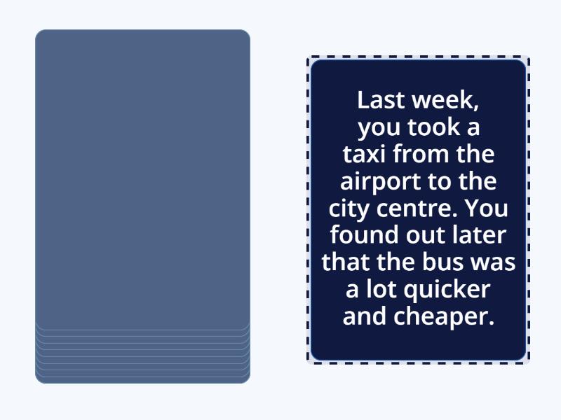 : Last week, you lost your passport at the airport and couldn`t board the plane to go on holiday., Last week, you parked your car on the high street but didn`t see the "No parking" sign and received a parking fine., Last week, you injured your neck in a car accident because you weren`t wearing a seatbelt., Last week, you took a taxi from the airport to the city centre. You found out later that the bus was a lot quicker and cheaper., Last week, you quickly paid the bill at a restaurant and later discovered the I restaurant had overcharged you., Last week, you forgot to water your plants and they died., Last week, you became sick because you didn`t take an umbrella when it was raining outside., Last week, you had a fight and got a black eye., Last week, you didn`t make an appointment with the dentist and later you I had a terrible toothache., Last week, you ate some undercooked chicken and had food poisoning.,