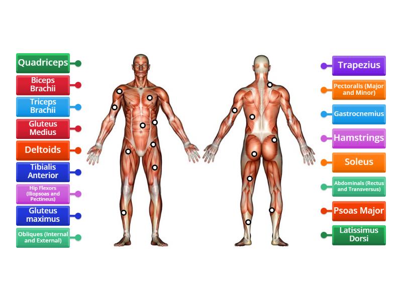 Triceps Brachii, Biceps Brachii, Pectoralis (Major and Minor), Quadriceps , Hamstrings, Gluteus maximus , Abdominals (Rectus and Transversus), Deltoids, Trapezius, Gastrocnemius, Gluteus Medius, Soleus, Latissimus Dorsi, Hip Flexors (Iliopsoas and Pectineus), Tibialis Anterior, Obliques (Internal and External), Psoas Major.