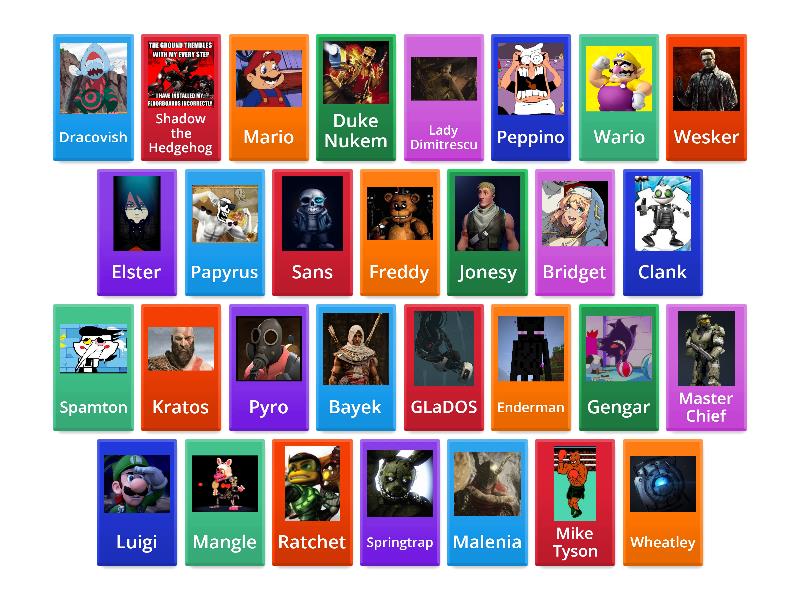 Mario, Luigi, Wario, Master Chief, Mike Tyson, Jonesy, Bayek, Kratos, Ratchet, Clank, Papyrus, Sans, Spamton, Peppino, Enderman, Malenia, Shadow the Hedgehog, Bridget, Freddy, Mangle, Springtrap, GLaDOS, Wheatley, Pyro, Elster, Lady Dimitrescu, Wesker, Duke Nukem, Gengar, Dracovish,