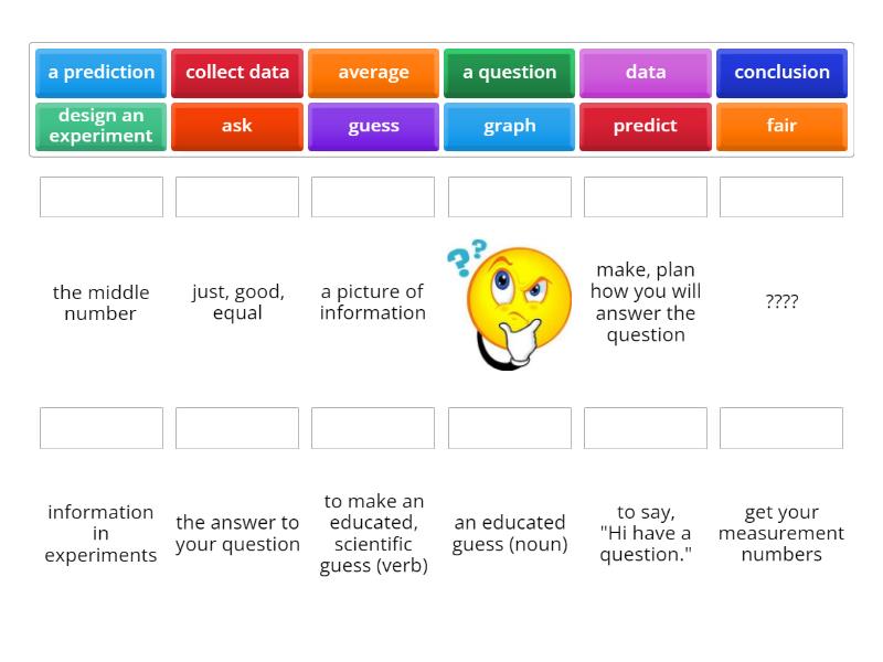 fair - just, good, equal, graph - a picture of information, average - the middle number, data - information in experiments, a question - ????, ask - to say, "Hi have a question.", guess, predict - to make an educated, scientific guess (verb), a prediction - an educated guess (noun), design an experiment - make, plan how you will answer the question, collect data - get your measurement numbers, conclusion - the answer to your question,