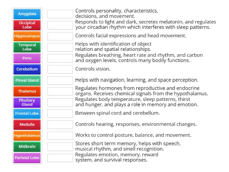Pons - Controls facial expressions and head movement., Midbrain - Controls hearing, responses, environmental changes., Medulla - Regulates breathing, heart rate and rhythm, and carbon and oxygen levels. controls many bodily functions., Amygdala - Regulates emotion, memory, reward system, and survival responses., Hippocampus - Helps with navigation, learning, and space perception., Cerebellum - Works to control posture, balance, and movement., Thalamus - Between spinal cord and cerebellum., Hypothalamus - Regulates body temperature, sleep patterns, thirst and hunger, and plays a role in memory and emotion., Pineal Gland - Responds to light and dark, secretes melatonin, and regulates your circadian rhythm which interferes with sleep patterns. , Pituitary Gland - Regulates hormones from reproductive and endocrine organs. Receives chemical signals from the hypothalamus. , Frontal Lobe - Controls personality, characteristics, decisions, and movement., Parietal Lobe - Helps with identification of object relation and spatial relationships., Occipital Lobe - Controls vision., Temporal Lobe - Stores short term memory, helps with speech, musical rhythm, and smell recognition.,