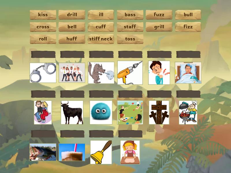 bull, kiss, cuff, fizz, roll, toss, staff, fuzz, bell, cross, grill, bass , drill, stiff neck, ill, huff,